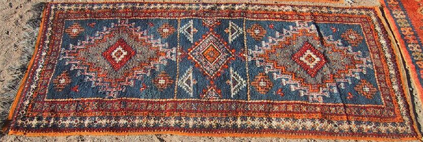 Piece 2.11426 was also made by Samira's grandmother. It's a small knotted rug in the Tazenakht style, in a deep red, grayed blue, gold and black. The large triangles in the black squares are called "takhalalt" in Berber, and they represent a piece of silver jewelry women use as a clasp on clothing; the Romans called them fibula. You can see the details better on the close up. It's about 2 x 3 1/2, measuring 2'1" x 3' 6". The price is $120. It is SOLD but can be remade.