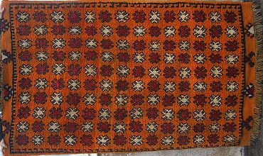 Piece 5.15447 has a rich blue-red ground with the accents in black, white and a lighter orange. The borders have flowers in them, unusual in these rugs. You can see one in the upper right corner of the detail. The size is about 4'8" x 6'8" (142 x 204 cm)and the price is $195.