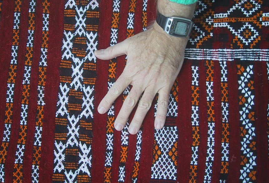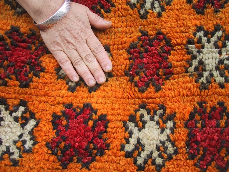 Piece 4.0006 is another knotted rug, this time from southern Morocco. It resembles some of the antique ones on the N'kob/Women Weavers section of my site except it is smaller - and much less expensive. I am selling this for a Moroccan friend who has had it for at least 25 years and taken good care of it; the price includes her shipping it from Morocco. This rug is in some of the traditional Tazenakht colors, orange (not too bright), a cherry red, and black and white. You can see them well on this detail. This rug measures almost 4' x 6 1/2' (about 47" x 78" or 120 x 198 cm) and costs $635.