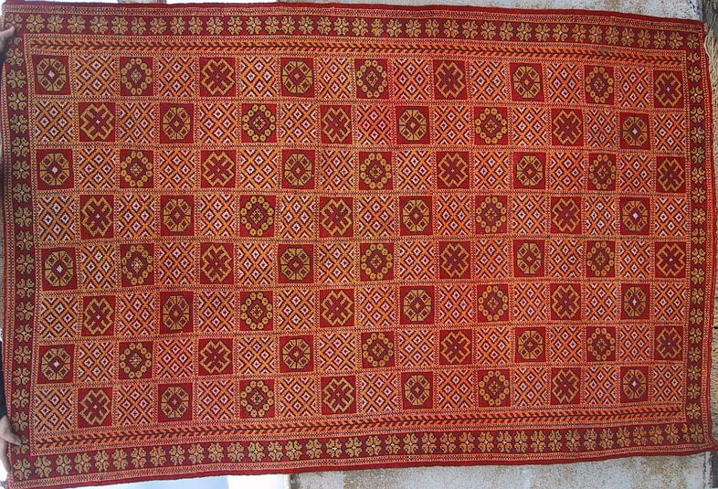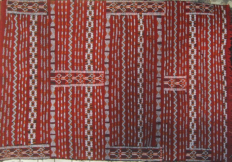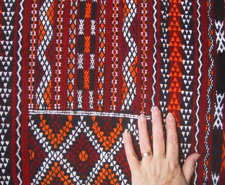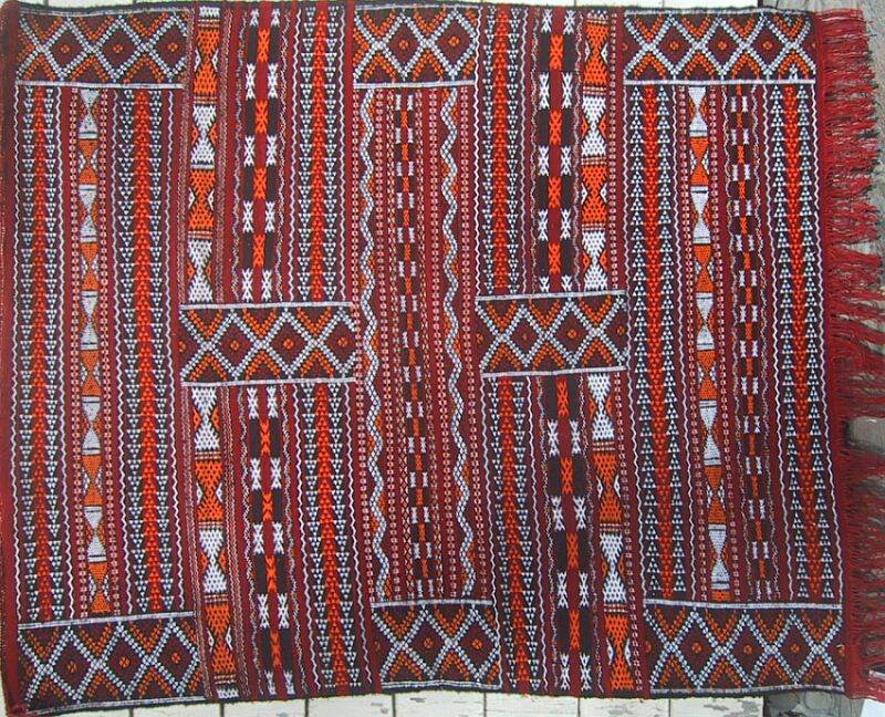 Piece 4.0009 is something you haven't seen here before, a Zemmour knotted rug instead of a flatweave piece. It is about 40 years old and in excellent condition. These are among the few Moroccan rugs to have two usable faces. Here you see the "back" of the pile side, and here you can see the knotted or pile side - you will notice that they are almost identical. You can see them side by side in this close-up. The flatweave side is on the left in that photo, and the knotted one on the right, and the colors are a bright red and a nice gold. The size of this rug is about about 4' x 6 1/2' (about 50.5" x 78" or 129 x 198 cm) and the price is $780, which includes airmail shipping from Morocco.