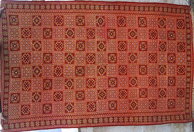 Piece 5.15435 has a fine pattern with more of an overall design than usual, including vertical bands in addition to the usual horizontal ones. The ground is a deep rich red, with accents in black, white and a somewhat light orange - not as bright and intense as it looks on my screen. You can see the fine work in this close-up. This piece measures about 47 x 56" (120 x 142 cm) and costs $165.