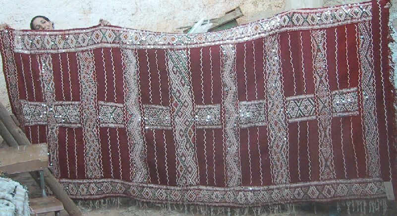 This is Itto Oumoush, who wove the two rugs and several pillows below. She has three children, two boys who are in school and a daughter of one and a half. The oldest son is 12 and lives with his aunt and goes to boarding school in a nearby town, since Ben Smim only has a primary school. Itto's husband works at the post office and also does some farming. When she sells a piece she uses the money to buy materials to start another - a common pattern. She might also use her earnings for household expenses, or to buy something for the children. Last time we visited her we suggested she make some smaller rugs, about 3 x 5 feet, since they fit many spaces so might sell more easily. Stay tuned to see if she does.