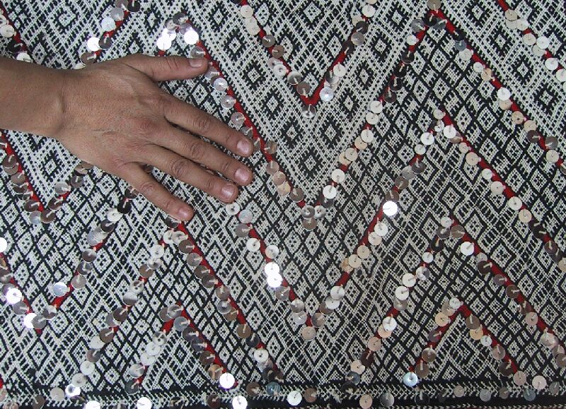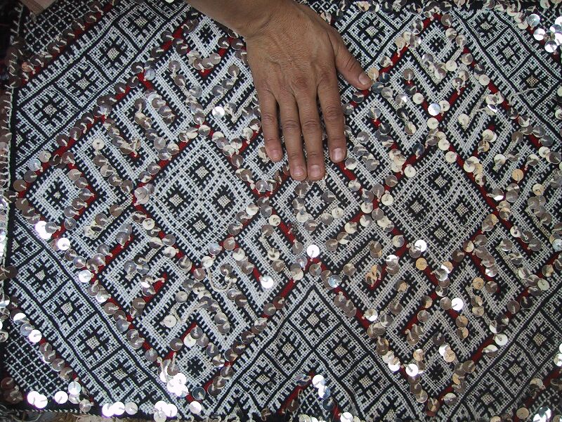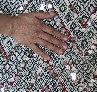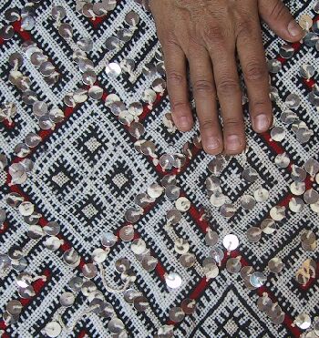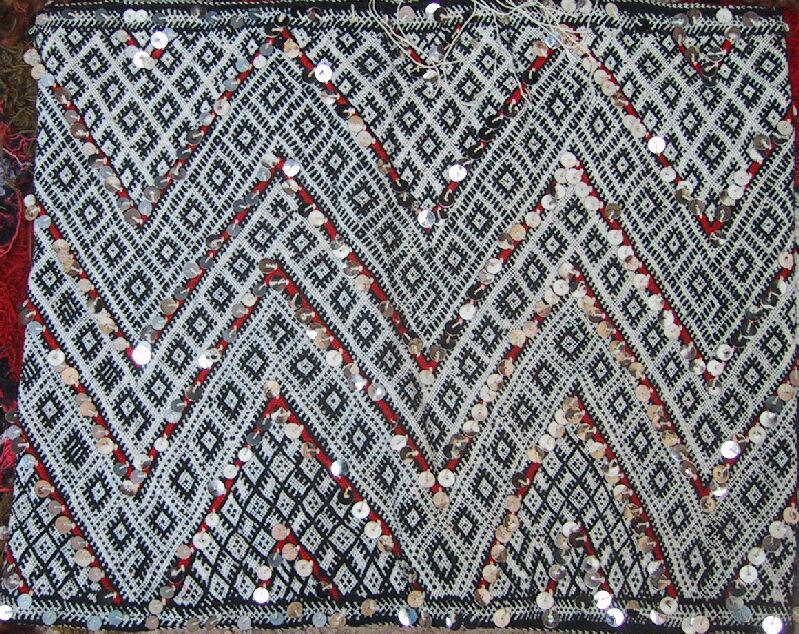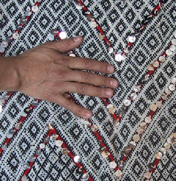 Piece 3.13073 is a large flatweave piece that Itto or her mother probably made for her marriage. It has an overall design in black and white, with accents in red brown yarn and sequins. You can see the colors better by clicking on the photo, and the overall design of the piece by clicking here. There are no plain stripes - the whole surface is covered with this fine design. This kind of weaving takes a long time to do, and that is reflected in the price. It measures about 5'6" x 12'2" and costs $660.