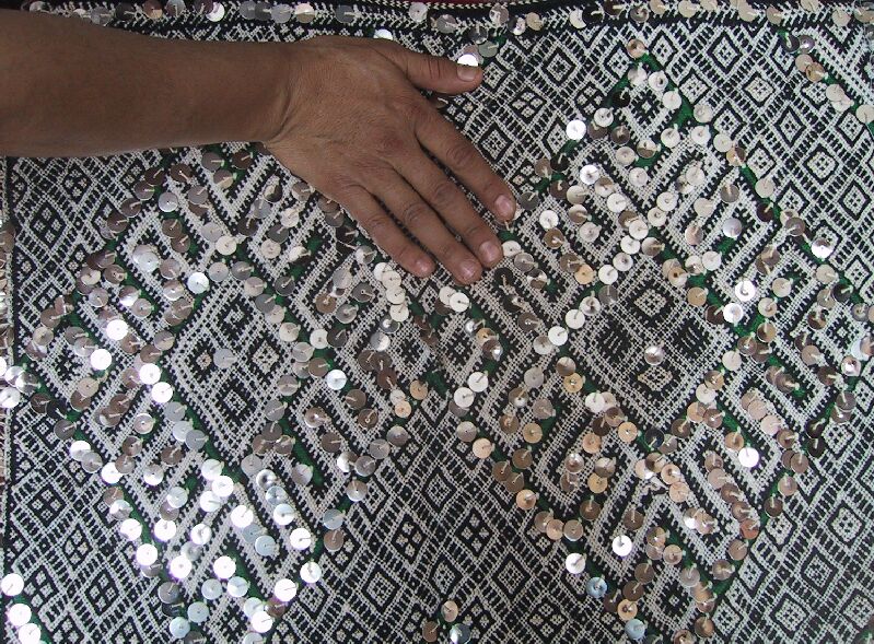 Pillow 3.13062 is again mainly black and white but this time there are more colors in the accents, including maroon, royal blue and neon orange. You can see the accents better in this close-up. The back is an unusual blue-green with a bit of beige or brown in it. At first I thought it might be a vegetable dye because of the soft color, but it was dyed in a nearby town. Itto made this and the pillows below before she was married, about 13 years ago. This one measures about 18" x 20" and costs $55.