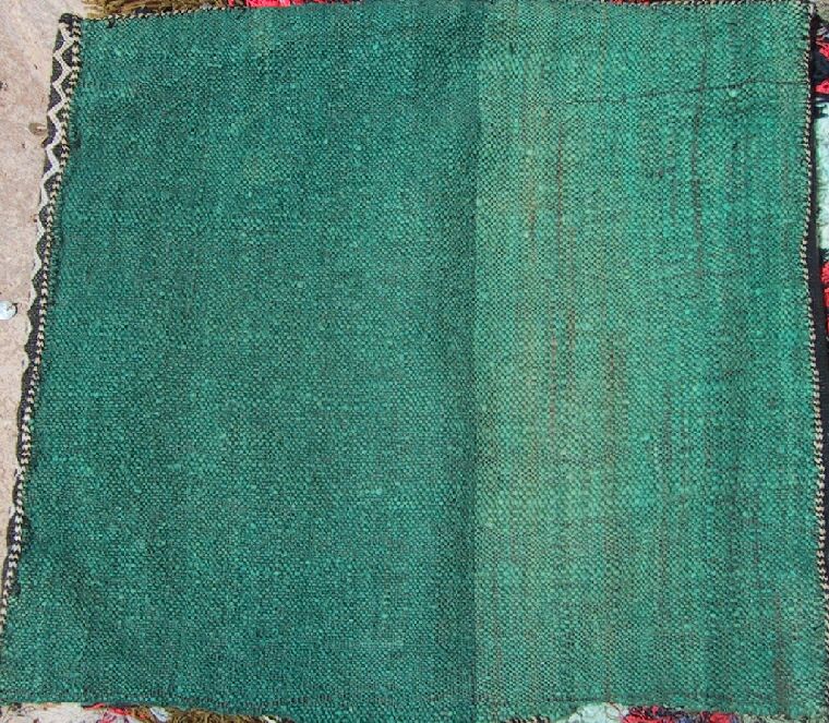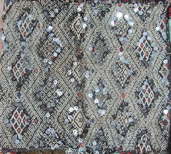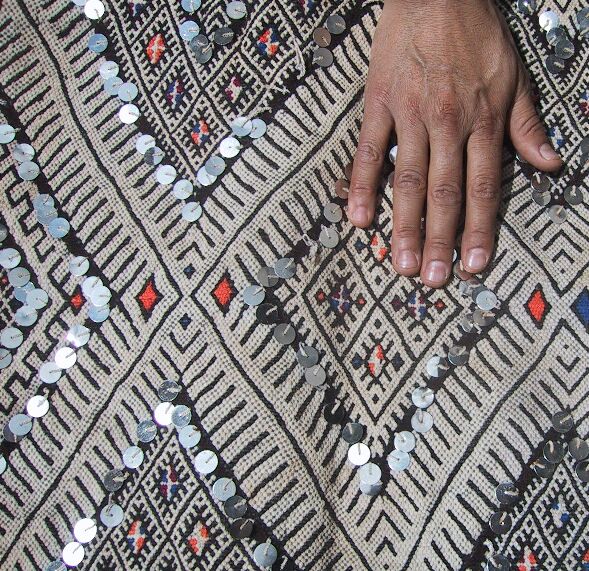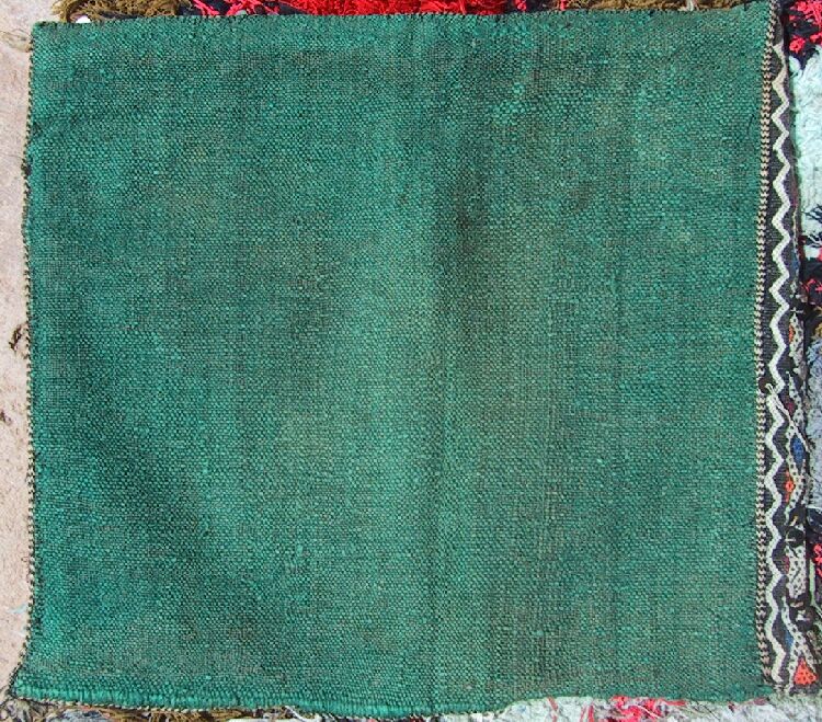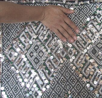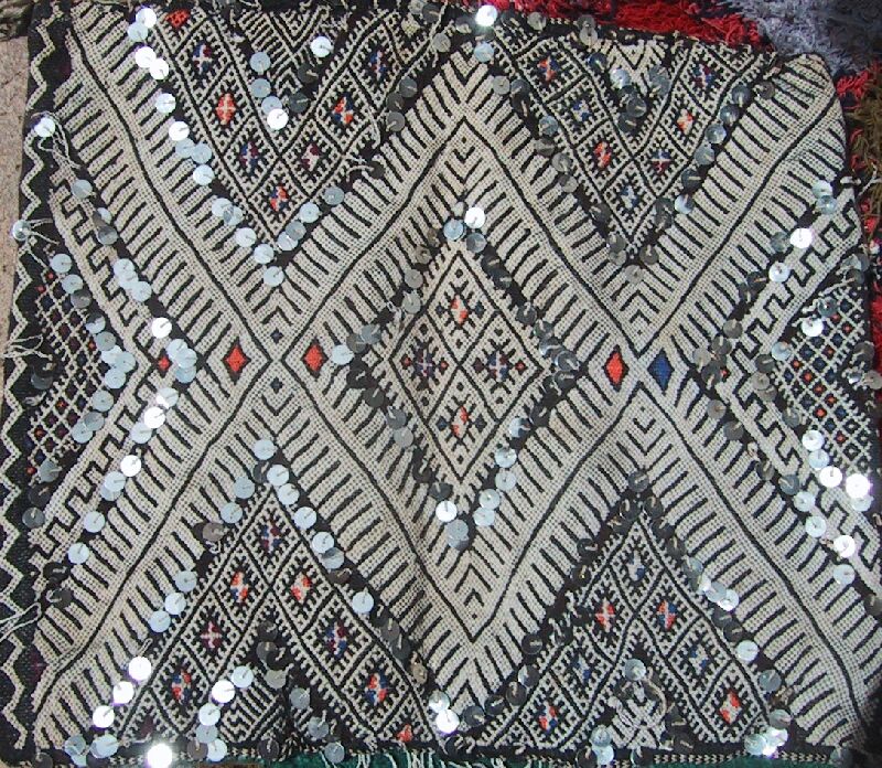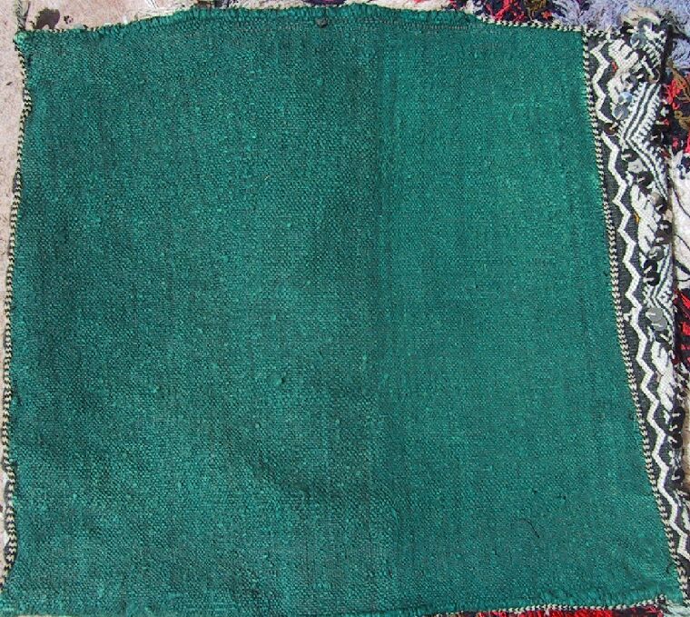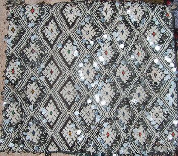 Pillow 3.13056 , also by Itto, has two large diamonds on the face, this time accented in a rich green outline and lots of sequins. Some of the white on the face is actually a shiny gray thread. Habiba explained that it is mainly used to attach sequins, but if you have some left over you might use it to weave. You can see the full pillow here. The back is plain red in two shades. This pillow measures about 18" x 22" and costs $58.