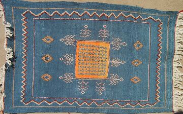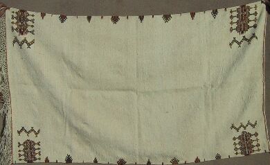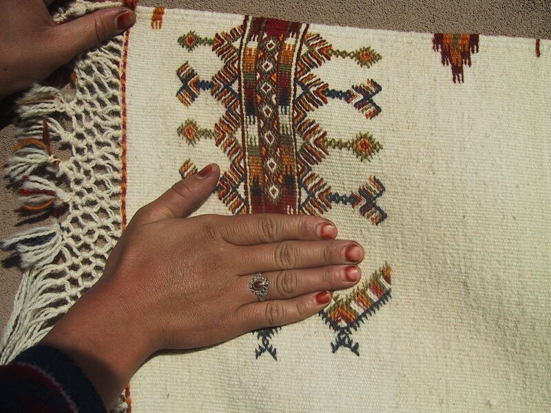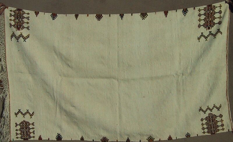 Piece 3.12784 is an example using natural dyes. It is called a tahaykt or cloak, and women wear them when going out to dressy events like weddings. The wool is plain off white, decorated with designs on the borders in dark blue, soft gold, yellow green and brick red. The colors are clearer in this detail. It does not lie flat, but that does not matter since it is worn. I would also use it as a wall hanging or to drape over a chair - it is too delicate for the floor. She and her mother also make pieces like this to order. The size is 3' x 5'3" and it costs $260.