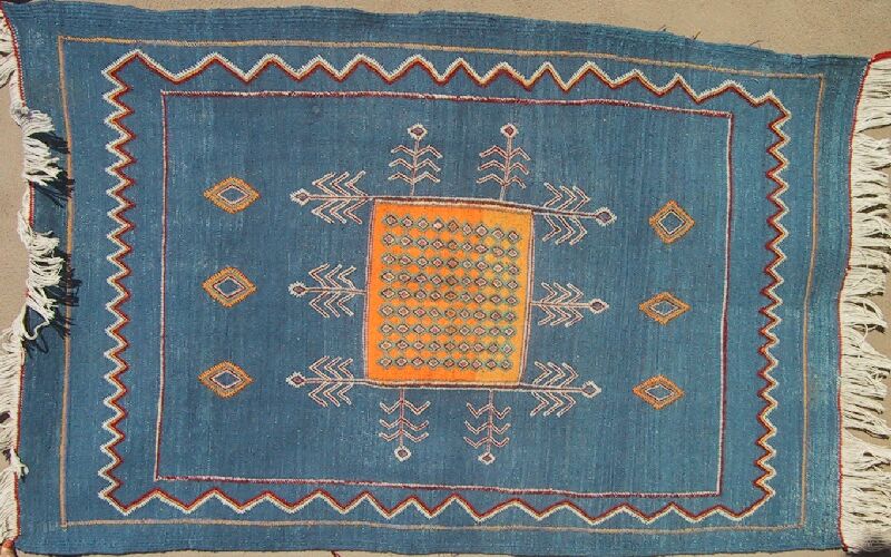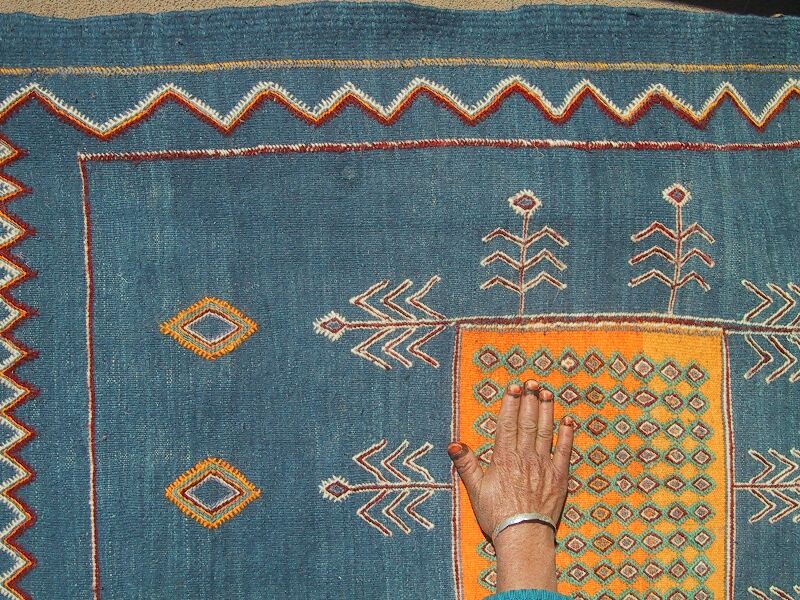 Piece 3.12790 is a small flatwoven akhnif in blue with a gold center that has some abrash or color change. The decorations are embroidered in a rich dark red, white, and a bit of violet and blue green. Those surrounding the gold center remind me of corn plants - perhaps the center is a field? You can see them better in this detail. The size is about 3' x 4'9" and the price is $120. SOLD