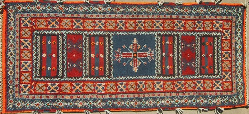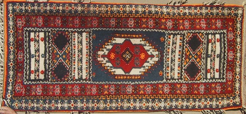 Piece 3.12792 is a small rug with both pile and flatweave sections. The black and white stripes near the ends are mainly flatweave, while most of the rug is knotted or pile. The main colors are a dark denim blue and red, with accents in yellow instead of the usual orange, and a bit of gray. In the close-up you can see where the red has run into the border in the upper left part of the photo, and there is a spot, but they are not prominent when viewing the whole rug. This piece measures about 2'4" x 5'4" (71 x 162 cm) and costs $175.