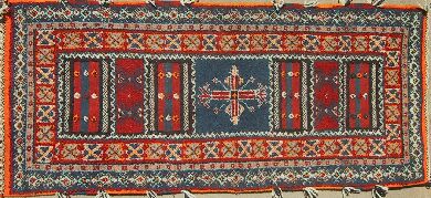 Piece 3.12794 is a small Glawa piece with pile, twining and flatweave. The central panel is pile in dark blue, and those on each side of it are flatweave in red and blue, the red bordered by black and white twining. Look at the close-up to see this better. This piece measures 2'2" x 5'1" and it costs $125.