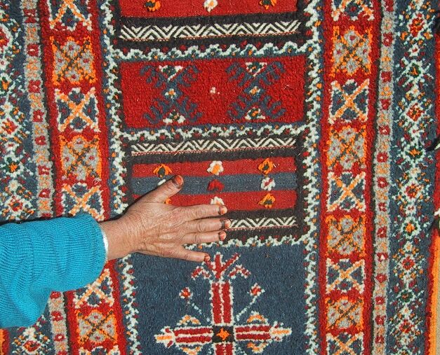 This is Fadma Bourais, who made the three rugs below, plus the one she is sitting on - but that has been sold. Her husband works in a market in the larger town of Ouarzazate, about two hours away. They have two daughters who are married, and one son in junior high school. It took her two months to weave the rug she is sitting on, since she worked on it alone.