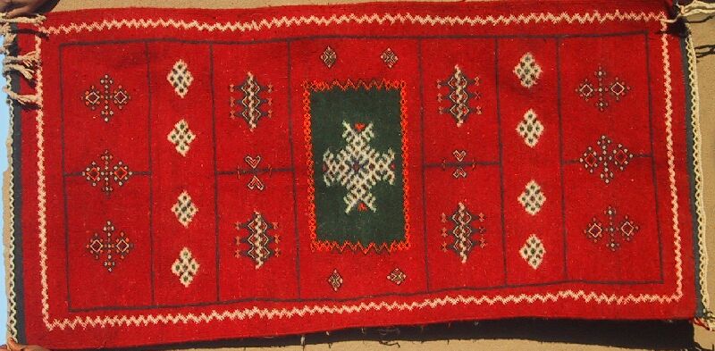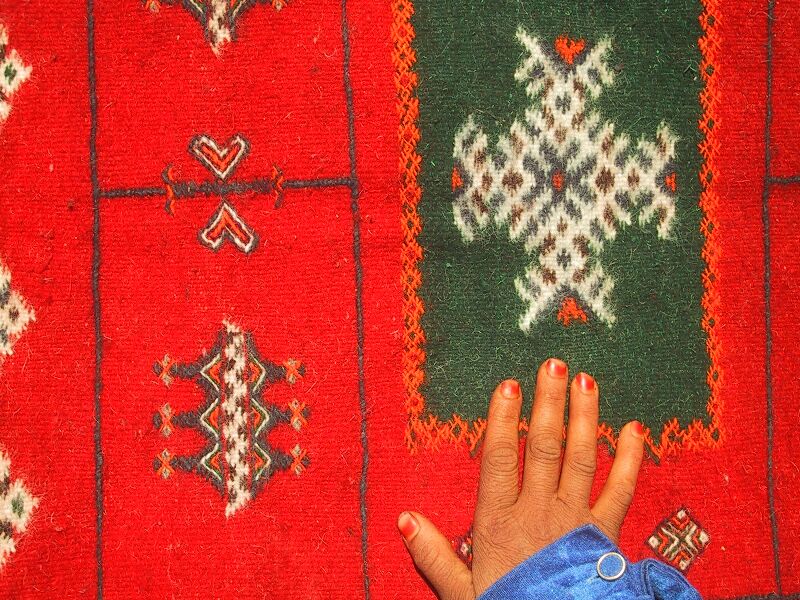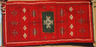 Piece 3.12812 is the one Fadma is holding above. It is a small flatweave in a rich red with designs both woven into it and embroidered on it. You can see them better in this detail. The center is green, and there are accents in white, orange and violet, with a thin line of blue at each end. It measures about 2' x 4' and costs $105. SOLD