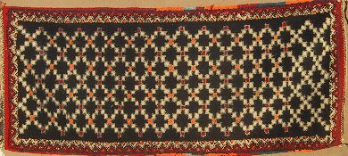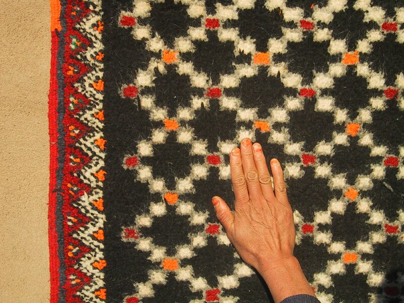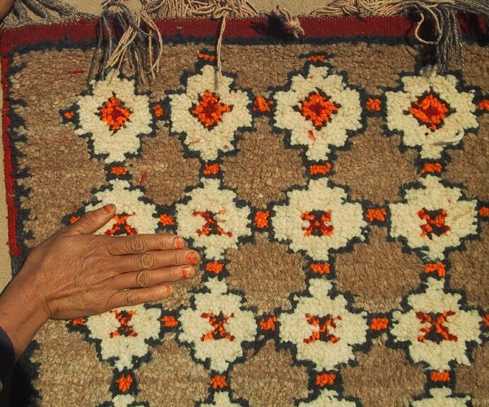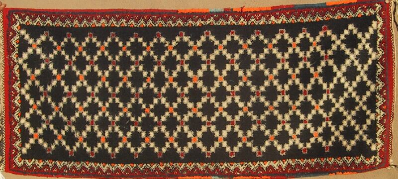 Piece 3.12814 is a pile rug in the lattice design, but using more colors than usual. Traditionally these rugs are black with gray and white lattices, but here Fadma has added red and orange accents. However, you will notice that the colors are not in the lattice at the right end. When I asked Fadma why, she said she didn't think of adding them at first. The borders also have red and orange, plus a tiny bit of green. You can see that better on the close-up. The size of this piece is about 2'4" x 5'5" and the price is $205.