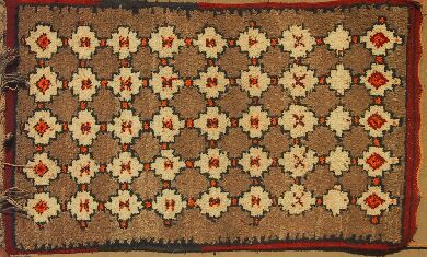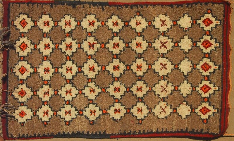Piece 3.12816 is a small pile piece with very unusual colors for this area. The ground is a natural tan with off-white designs accented with orange and red and outlined in a very dark blue. You can see the colors better in this detail. This piece measures 2'2" x 3'7" and it costs $125. It is SOLD, but could be remade, especially given the unusual colors for this area (you won't see anything similar).