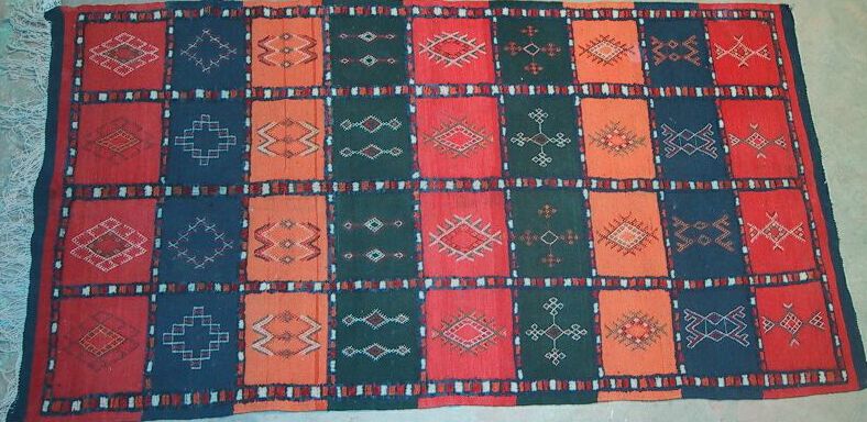 Piece 3.12724 is also by Jamila. It is an akhnif or flatweave, with the squares in it separated by borders of pile. The colors are a rosy pink, soft gold, dark denim blue and a dark green. You can see them better by clicking on this photo to enlarge it, or by clicking on the close-up. In each square, designs are embroidered. It measures 3'8" x 6'10" and costs $250. SOLD