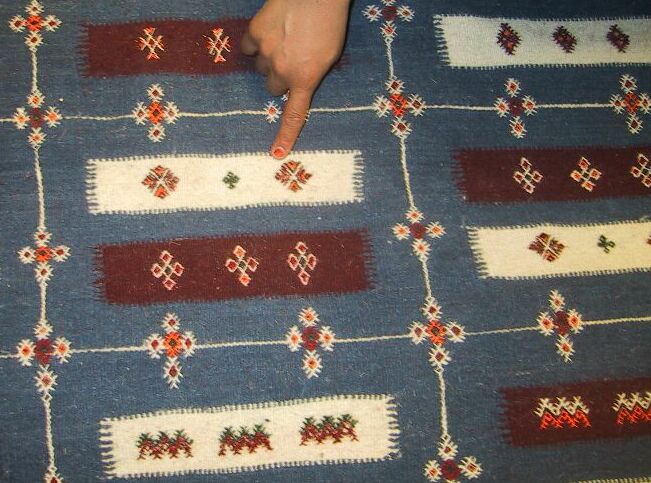 There is also another recent change. On my March 2003 visit to N'kob, the school principal Si Houcine suggested that perhaps rug sales could help the village primary school a bit. He knew that a percentage of each sale goes to help the village development association, which in fact contributed it to help the school build latrines. The principal suggested that a small percentage, like 2% of the weaver's price (not subtracted from her price, but added to it), might go toward the needs of the primary school. There is a village PTA (Parent-Teachers Association) and the money is being put into their account; in fact, they needed a minumum balance of 600 dirhams or about $60 to open it, and much of that was from their 2% on each rug sold. Thus sales of the following pieces will help improve the primary school for these village children.