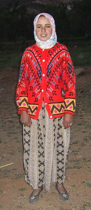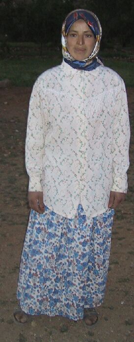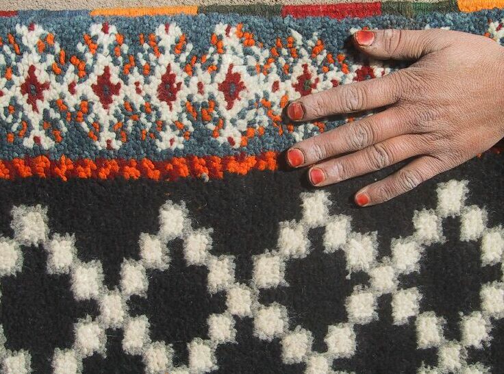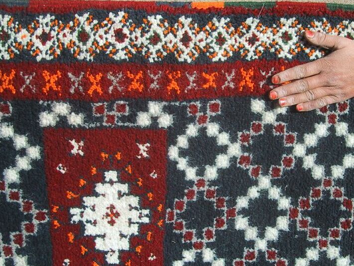 These are the Oukrim sisters, skilled and productive weavers who made the rugs below and also some on previous pages. Sometimes two work on a rug and sometimes all three of them. Khadija is the eldest and divorced, and Fatima is the youngest, who I think is in the center. They give the money from the rugs to their father, who uses it for household expenses. In fact, when I asked them what they had done with the money from a previous rug they sold on this site, their brother nearby patted their father on the stomach!