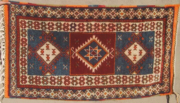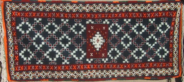 Piece 3.12750 is a medium pile rug in the Tazenakht style. There are the three central panels, here separated by bands in a rich blue-red. The end panels are on a dark navy blue base and there are accents in bright orange and white. The rug has a complex set of borders which you can see better on the close-up. It does not lie totally flat right now, but will probably flatten out with use. The size is about 3'7" x 7'4" and the price is $555.
