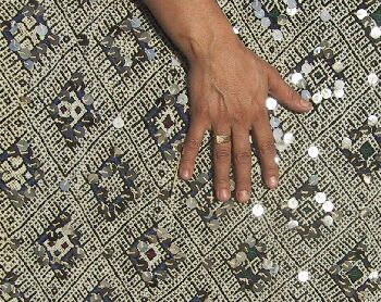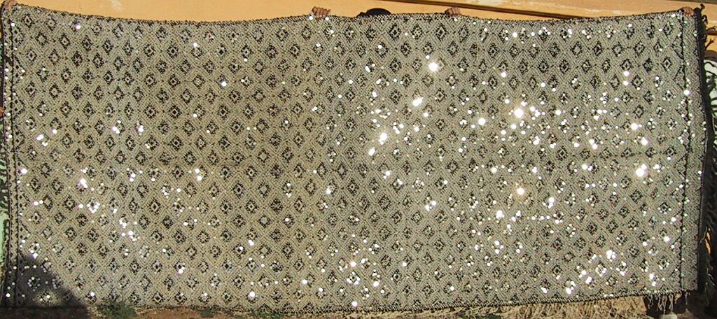 Piece 2.12331 is a detail of a piece from Aicha's trousseau. She made it with her mother before she was married, and it took them about a year and a half, working every afternoon except Fridays. The overall design can be seen here. It is white on a black ground, with small touches of red, green and blue in the small diamonds, and lots of sequins; you can see these best by clicking on the small photo. It's quite expensive, both because of the time and fine work, and of all the sequins. Additionally, the size makes it heavy to mail. It measures 5'1" x 12'6" and costs $765.
