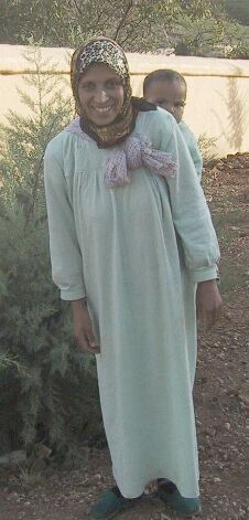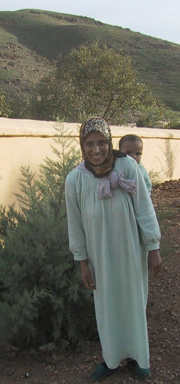 This is Aicha Amrar, who made the rugs below. She is shown with her one son, who is a little over a year old. Women traditionally carry their babies in a sling on their backs like this - the baby gets lots of body contact, and the mother's hands are free. You might see her husband, a guardian at the village primary school, holding up rugs in some of the photos. She notes wryly that most of her rugs were made before her son was born, when she had more time to sit down and weave. She began weaving in 1994, learning from her mother by making a small bag. She made two rugs and six pillows to bring to her new home after marriage. This is a custom in this area: young women and their mothers make a trousseau for the girls to take with them when they marry. If she sells enough pieces, she plans to use the money to buy a refrigerator, so she can cool her son's milk in the hot summer months.