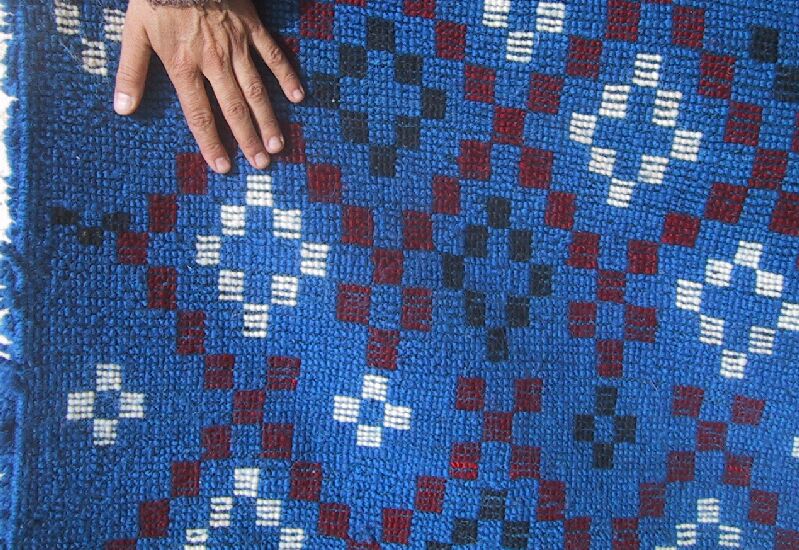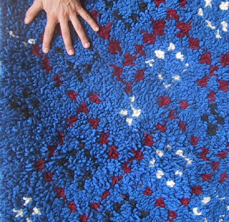 Piece 3.12885 is a knotted rug in royal blue with accents in white, black and dark red. In the photo you see the flat face of the rug, and you can see a close-up of it here. Click here to see a full photo of the pile side, and here for a close-up. Moroccans use both faces of these rugs: the flat side is cool in the summer, and the knotted or pile side is warmer in the winter. This is a medium-sized piece, measuring about 3'4" x 6', and the price is $380.