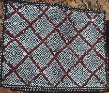Piece 2.12555 was made by Fatima Sookar. She didn't want her photo taken, but said we could mention that she has three children, an older son and daughter plus a younger son. The daughter is in her teens and embroiders but does not know how to weave. If Fatima sells this pillow, she would use the money to buy food for her family, or perhaps tennis shoes for a son or put it toward a gold bracelet for her daughter. The pillow is mainly black and white with red highlights on the face, seen better in this detail. It has a black back with white designs that remind me of snowflakes. The size is 17" x 20" and it costs $48. SOLD but she could make more.