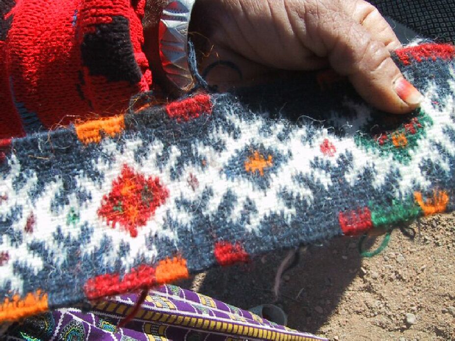 This is Rqia Agourram, whose daughter Eaniya Bouazza, wove the belt she is holding. Eaniya is 28 and not yet married, so she lives with her parents and helps with the weaving.