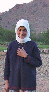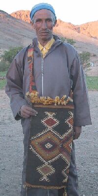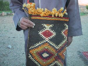 You don't see many men in these photos, but this item is a travel bag traditionally used by men, so a man is demonstrating how it is worn. It was woven by Fadma Buhassi, the mother of Fatima, the young woman above. You can click on the photo to see it more clearly. Although it looks like an antique, it was woven about 3 years ago.