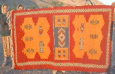 This is Fatima Wahman, who made both the rug above and the one below. She is now 17, and made the rug above to learn weaving. She said it took her about two weeks. The rug below is larger, and she made it with her sister and a cousin. The money from the rugs goes to her father, who spends it for family needs, for example to take Fatima's mother to the doctor. Men rather than women shop at the markets, so they handle the money.