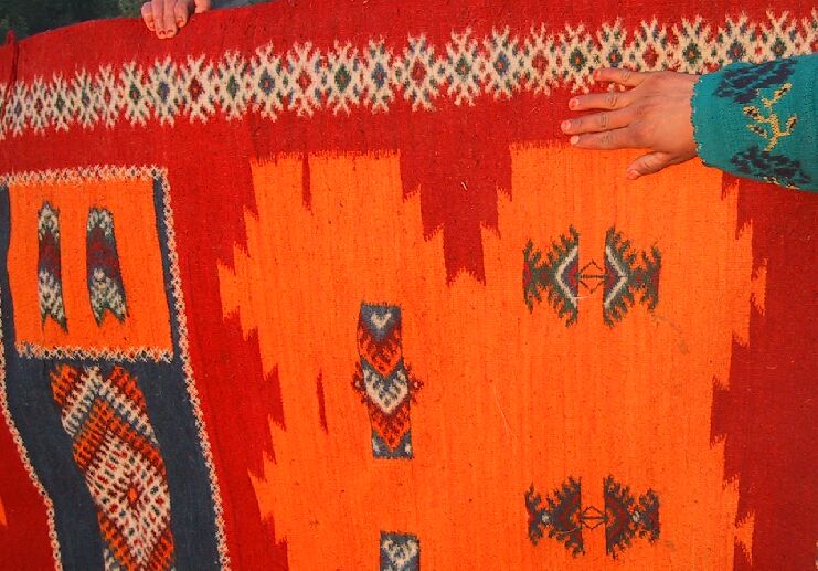 Piece 2.11429 reminds a friend of a Native American flatweave, and there is some speculation that Berber designs on Spanish saddlebags and rugs reached the Southwestern US hundreds of years ago. The main colors are red and an orang-gold, with a bit of blue in the center. You can see the detail, including the finely-woven designs, if you click here. It measures about 4' x 6'9" and costs $345. SOLD, but you can have the same piece woven to order.