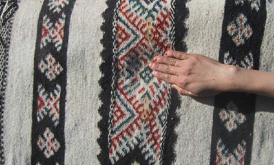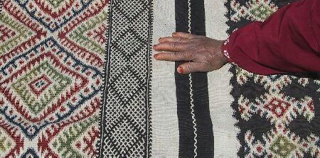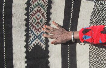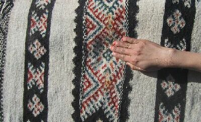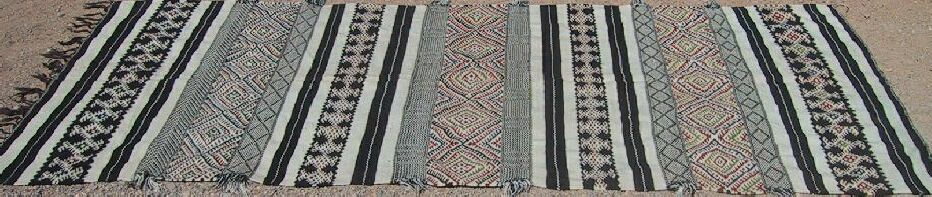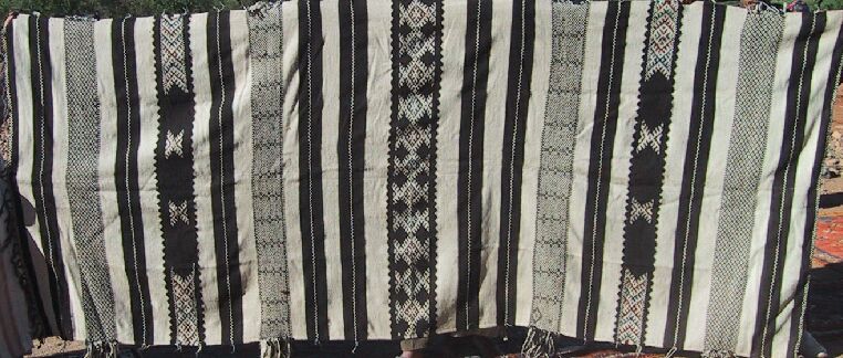 This page contains a specific kind of rug, the chedwi or lehemel, made uniquely in part of the High Atlas Mountains in southern Morocco. They are long and narrow, mainly in black and white in two weaving styles: flatweave and twining. The plainweave sections are stripes of one color, black or white, and the twining has black and white yarn mixed to form patterns. They often have woven designs in colors, and these colors are often natural dyes. For this reason, and also because these pieces are often old and rarely made any more, they have become collector's items and are quite expensive. But if you love good weaving and unique pieces, you may be tempted to buy one.