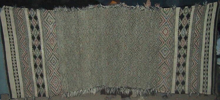 Piece 2.11401 is a chedwi in black and white with natural dye designs in olive green, a brown-red and blue. It was made by Rahma Id Ali and Rqia, who I think are sisters and co-wives of one man - it was getting late and I didn't check carefully. People said this piece was made around 1960, so it's over 40 years old. However, some parts do not really lie flat, which you can see from the panel on the left here where it buckles near the bottom. This is because it is difficult to get the weaving tension exactly right with the different styles of weaving. Especially if you were to display it on a wall, this should not be a problem. You can see the full rug with the overall design by clicking here. You can also see that it does not appear to buckle too much. This piece measures about 5'2" x 11'3" and costs $1,665.