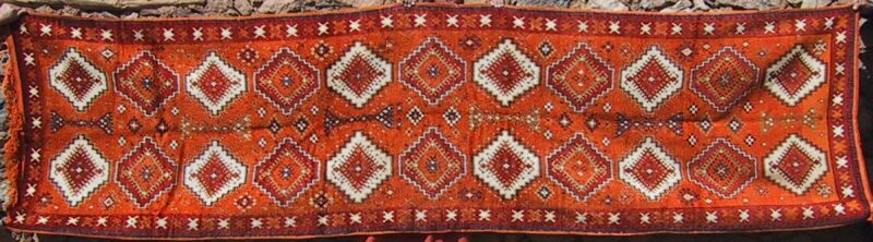 Piece 3.13575 is a long pile runner in orange, with designs in a rich warm red and white. The line down the center is from being folded. The 'diamonds' are sometimes outlined in an indigo tone of blue [I asked and the dye is not natural indigo], and there are also accents in a soft sage. You can see both in this detail. The wool also has some sheen to it. There is a small hole at one end, and a tear that goes into the knotted area at the other end, and it is a bit gathered at one end. None is a serious flaw for an older piece like this, but I want my customers to be aware of potential problems. The size is about 3'8" x 14' (112 x 426 cm) and the price is $4450.