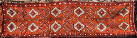 Piece 3.13572 is a long older pile rug with an orange ground and red-orange and white designs. Notice how they are in diagonal rows of the same color, almost forming a V under the center panel. And notice how they appear to be peeking out from behind that panel. In the close-up you can see how well the red and orange harmonize. You can also see there how some designs are outlined in navy blue or a soft olive green. The wool also has some sheen to it, found in some older rugs. This piece measures about 5'4" x 12' (162 x 365 cm) and costs $5100.