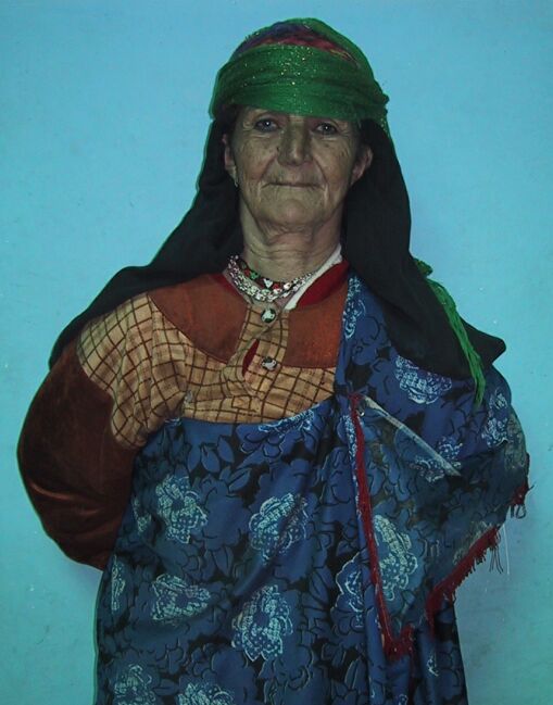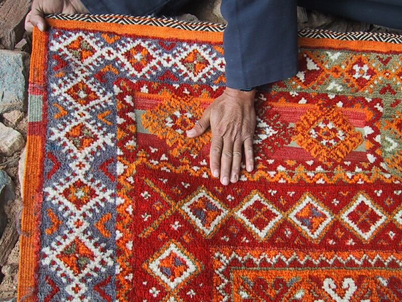 This is Rqia Akhrass, a dignified older woman in N'kob. Her family said she made the four rugs below in the sixties, and they have kept them in good condition until now. Notice the difference in colors and design from most of the N'kob rugs you've seen. These are mainly red and orange, and the designs appear to be more overall than the three-panel style. In fact, three of the rugs below have three sections, but they are much less marked than in most of today's rugs. Rqia lives with her aging and blind husband and her three sons' families, all in one home. She also has three daughters, but they too are grown up and have married and left. The pretty Khadija Id Yassine above is one of her daughters-in-law, and the village maqqadam or local official is her son. You will notice these prices are much higher than other pieces. One reason for this is that they are older and in excellent condition: you rarely see items like this for sale any more. Again, the men set the prices and I did not discuss them.
