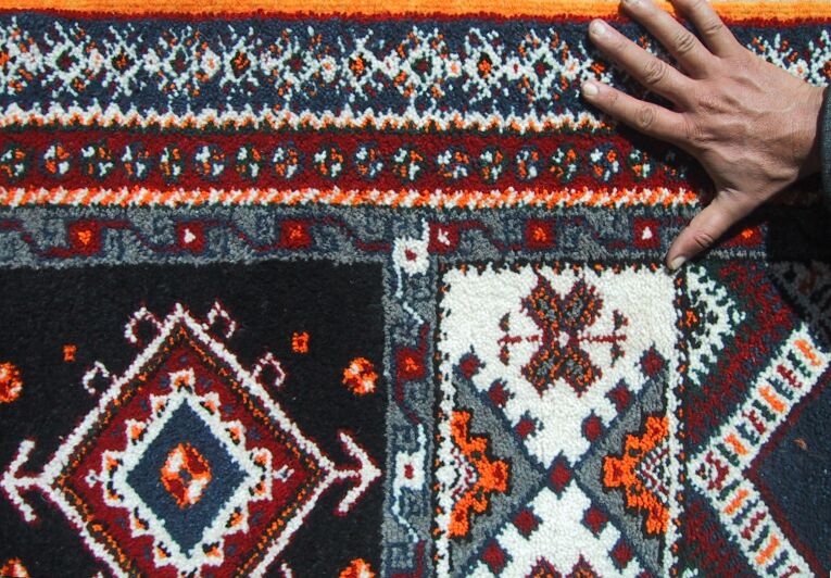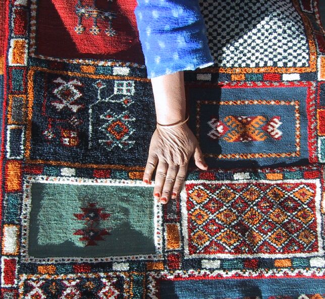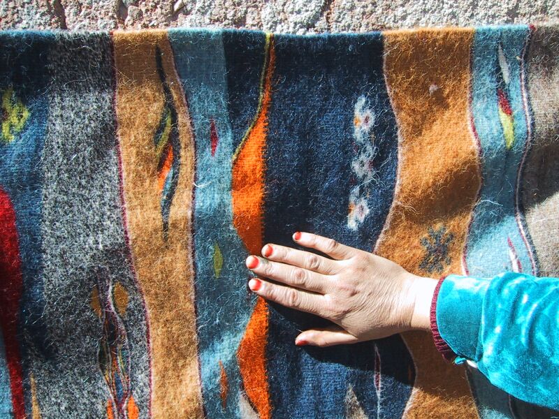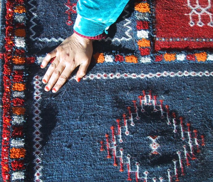Piece 3.13634 is in a style I have never seen in Morocco, both in terms of the free-form overall design and in the use of curved instead of geometric lines. In addition, this rug depicts things from nature, while usually rugs are just geometric designs. The red and yellow line indicates the top and is surrounded by sky, and what is underneath is what you would see from one of the nearby mountaintops: hills, mountains, a river....The colors also reflect nature in their softness, and some of them are the natural wool color, while the tan is dyed with tea. In this detail you see a gracefully curved abstract leaf in the tan area above the hand. While the overview makes it look like this flatweave rug may not lie flat, it should with a rug pad; the bright sun accentuates the shadows. This piece measures about 3'9" x 5'2" (114 x 157 cm) and the price is $330. SOLD but could probably be redone.