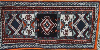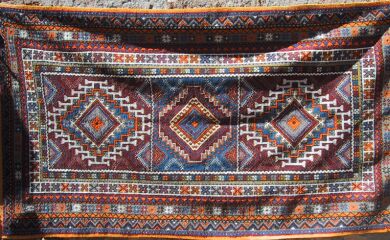 Piece 3.13632 is a small piece with both flatweave and pile, the kind called a teelwa or picture rug above, although here the "pictures" are less varied. Inside the frames made in pile is embroidery on flatweave, although the embroidery is done as part of the weaving, not later with a needle. You can see this best in a detail. The colors are a blue-red and navy blue, with accents in white and orange. The size is 3'8" x 5'4" (81 x 162 cm) and the price is $170.