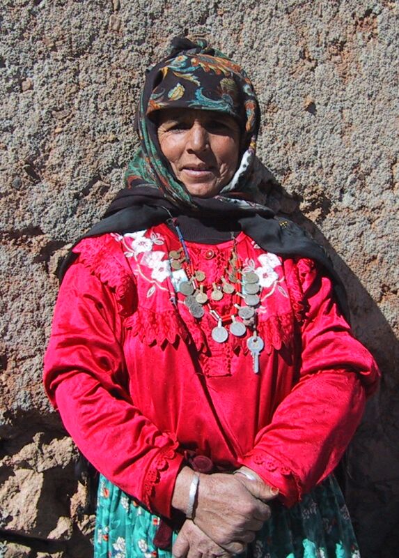 This is Aicha Seqqat, one of N'kob's two femmes leaders or women leaders; you have seen her before. When the village development association wants to inform women about anything (including health - or - coming to have their rugs photographed for the Internet), they have Aicha and her colleague Fadma contact the rest of the women. Most of her children are older, but one daughter weaves with her, and made the woman's cloak that she is holding - you can read about ordering it earlier in these pages. Aicha's husband washes rugs to prepare them for sale, and Aicha made the two rugs below.