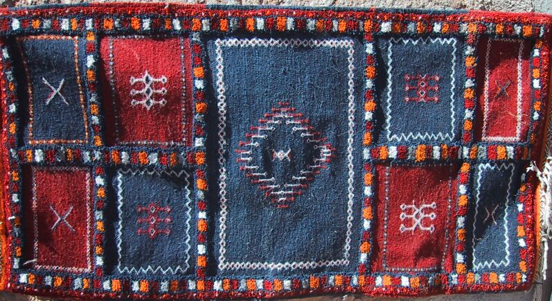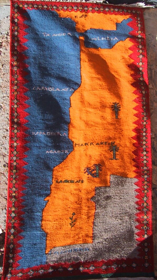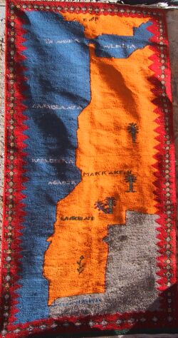 Piece 3.13630 is really unique: it is a map of Morocco, and I've never seen another like it. Jamila said she designed it herself. It is a medium sized flatweave or akhnif, but I wondered if Moroccans or Moroccophiles living outside Morocco might want to put it on a wall as a decoration and/or conversation piece. On the close-up you can see the city names and palm trees more clearly. The colors are a bright red, gold-orange, denim blue and natural brown for the sand of the Sahara at the lower right. It looks a bit lumpy here, but should lie flat with a rug pad. It measures 3'6" x 7' (107 x 213 cm) and costs $245.