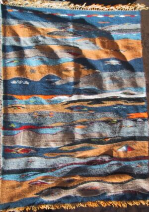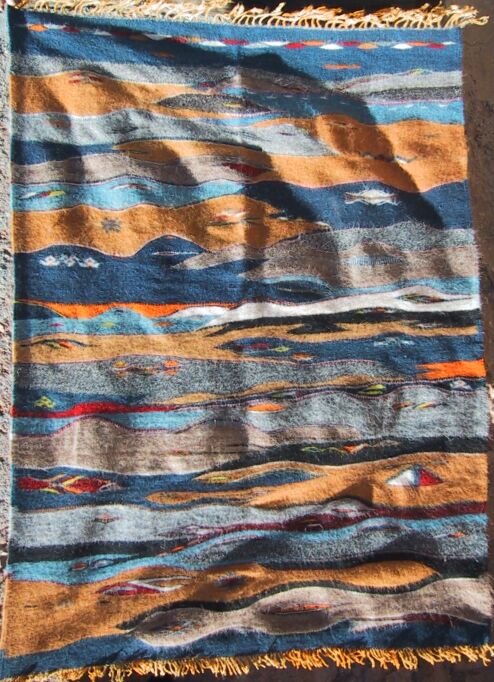 The piece below was made by Jamila's sister Sofia Sama who is married and lives about an hour away in the market town of Tazenakht. She has three sons and two daughters who are all in school. Her husband is a day laborer, finding whatever job he can in areas like construction, so her weaving really helps with family finances. You can see from the unique design below that weaving creativity seems to run in the family.