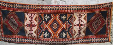 Piece 3.13644 is a medium rug in the Glawa style, meaning it has three different kinds of weaving. Here the plain pink and blue stripes are flatweave, the center and side panels and borders with designs are in pile, and the black and white designs you see at the top right in this detail are made by twining. Accent colors are a rusty gold and sage green. The size is 3'6" x 6'11" (107 x 211 cm) and the cost is $405.