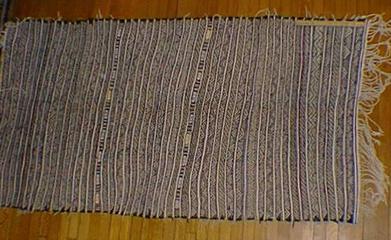 This piece fully fits the model of what I'd eventually like to do with rugs online: get the profit directly to the women who make them and avoid the middlemen. I bought it from a non-profit group which works with needy women weavers near the town of Taliouine south of Marrakesh. You can see and read about the weaver by clicking on her name, Ijja . She made item 8.061032, called a chedwi in Moroccan Arabic. That refers to a black and white piece with both flatweave and twining elements. Here, the twining is in the areas with black and white combined in zig-zag, checkerboard or small diamond patterns. The digital camera doesn't do the full piece justice, but you can see the close-up for more detail of the interesting weaving styles, and also the small red bands that flank the black ones. This piece measures about 4'4" x 8' and costs $180. SOLD but you could order another.